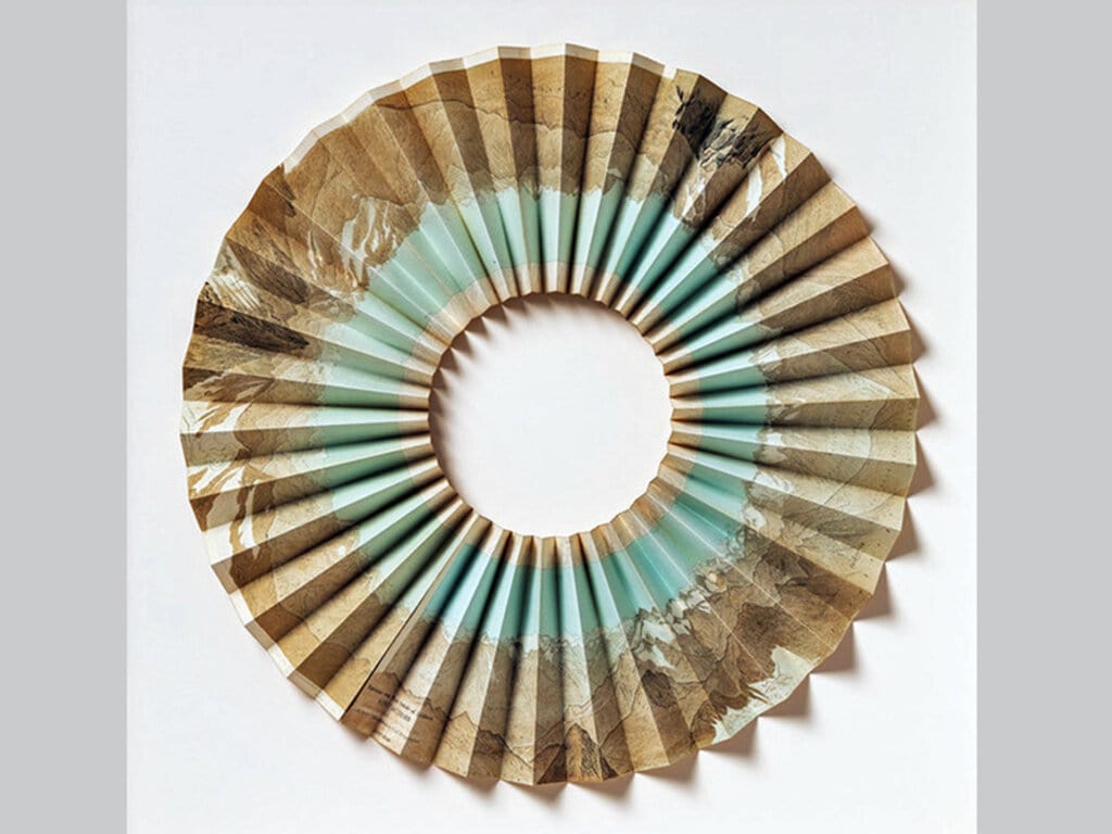 Die Künstlerin Ulrike Heydenreich hat dafür eine ganz eigene Methode gefunden. Sie sucht in Antiquariaten nach Fotografien und Panorama-Karten aus dem 19. oder Beginn des 20. Jahrhunderts. Und verarbeitet diese zu wunderbar zarten und einfühlsamen Papierskulpturen. Vorhandene Faltungen von Karten nimmt sie auf und führt sie weiter. Rund aufgefächert ermöglicht sie uns mit ihren zauberhaften Werken diesen ganz speziellen Panoramablick.