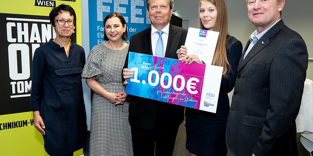 In diesem Jahr wurden wieder sechs Studentinnen aus Bachelor- oder Masterstudiengängen der FH Technikum Wien ausgezeichnet: vier für herausragende Leistung mit einem Notenschnitt unter 1,3 im vorangegangenem Studienjahr, eines für die Vereinbarkeit von Familie & Studium und eines für die Vereinbarkeit von Beruf & Studium. Die Anerkennung umfasst einen Gutschein für die Studiengebühr für Winter- und Sommersemester sowie 1.000 Euro in bar, die vom Fachverband der Elektro- und Elektronikindustrie und von der Fachhochschule Technikum Wien gesponsert werden.